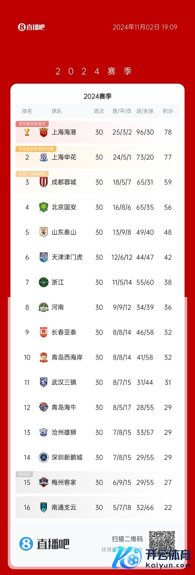来岁邂逅!中超最终积分榜:海港78申花77 蓉城59国安56泰山48体育集锦