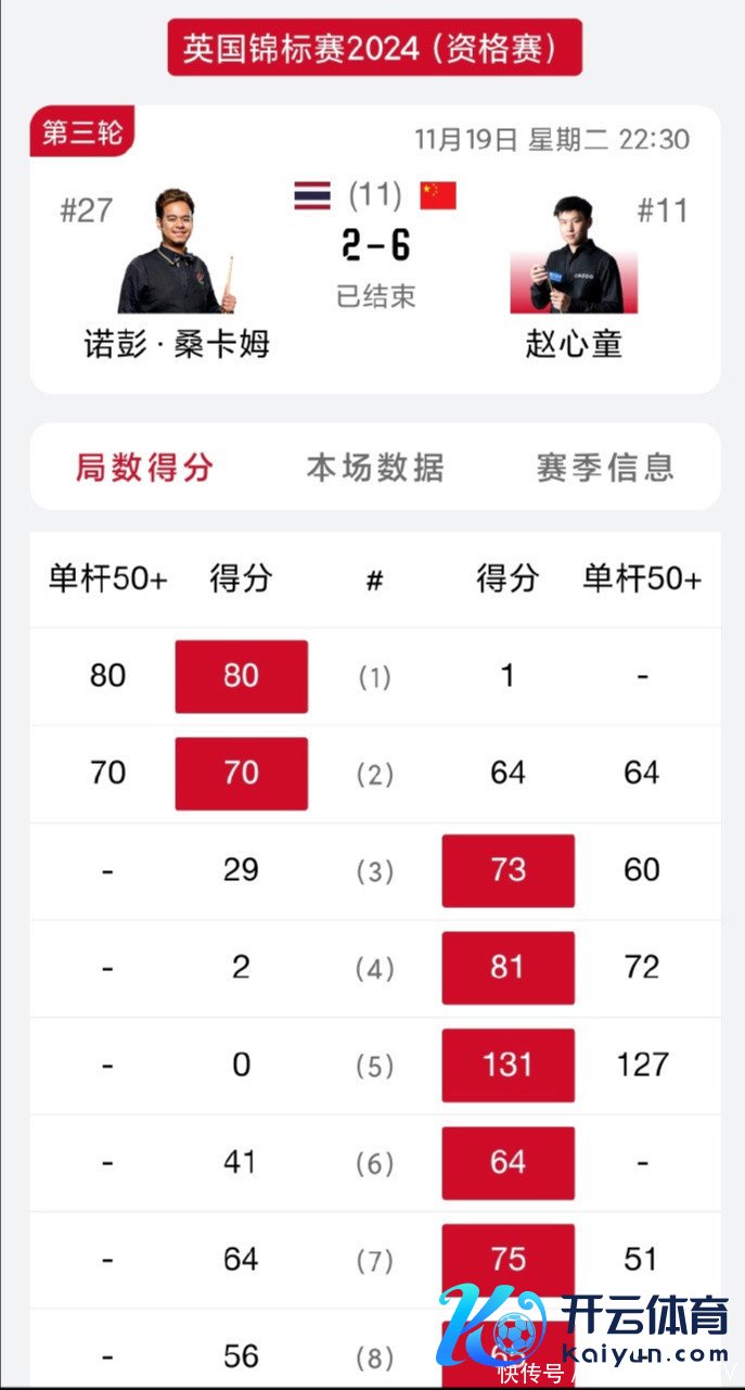 履历赛第三轮,赵心童的敌手是泰国选手诺鹏-桑坎姆,后者寰宇排行第27位,他在履历赛前两轮轮空。这场履历赛第三轮的比赛体育集锦,桑坎姆开局格外强势,很快取得2-0超越上风。接下来的比赛,插足赵令郎的节律,他连扳六局以6-2大逆转晋级,道贺赵心童!