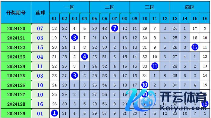 上期开出蓝球号码01,近10期,一区开出4次,二区开出1次,三区开出3次,四区开出2次,总体走势:二区进展较冷,本期看好蓝球号码:05。