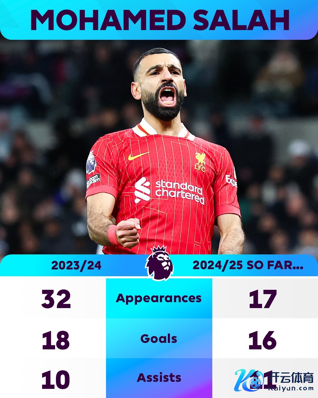 萨拉赫本赛季英超17场16球11助攻,上赛季英超32场18球10助攻。本赛季英超还剩21场(利物浦少赛1场)体育录像/图片,萨拉赫助攻数已超上赛季,进球数只差2个。
